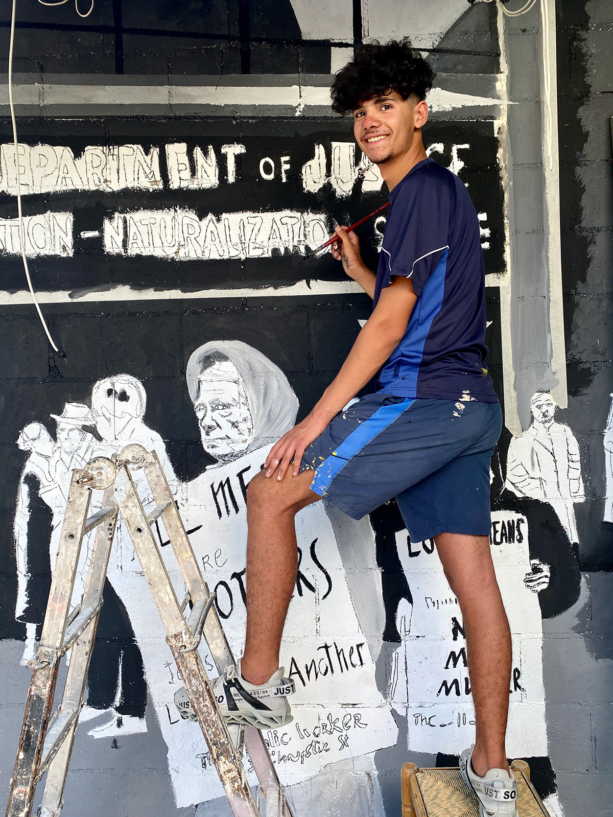 Sabah fue fundamental para el proyecto del mural. Desde el primer día que llegué al sector 4, este joven de origen sirio, que huyó de Alepo durante la guerra de Siria junto a su familia, se convirtió en mi compañero inseparable. Estuvo a mi lado durante las casi tres semanas que dedicamos a pintar la obra en pleno verano.